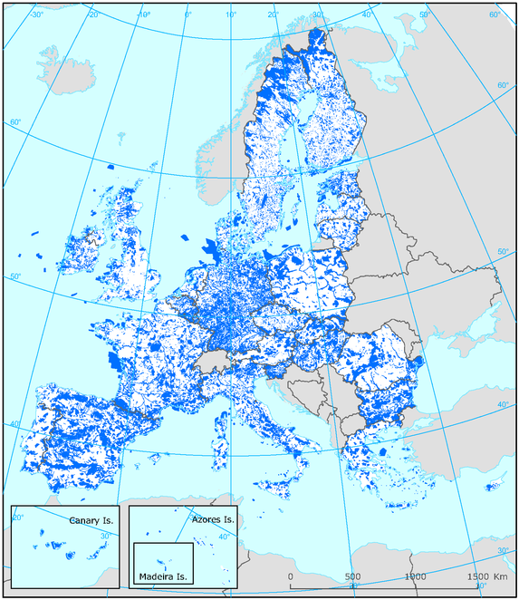 En bleu le réseau Natura 2000 dans les 27 pays de l'Union européenne
